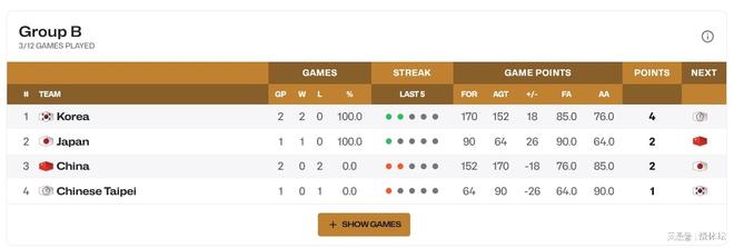 此外,本组韩国、日本都取得2连胜,双方的形势相对来说都非常不错。中国台北队的综合实力相对较弱,目前也是遭遇到2连败,小组出线希望并不大。