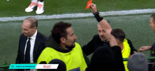 第90+8分钟,阿莱格里不满判罚,被红牌罚下