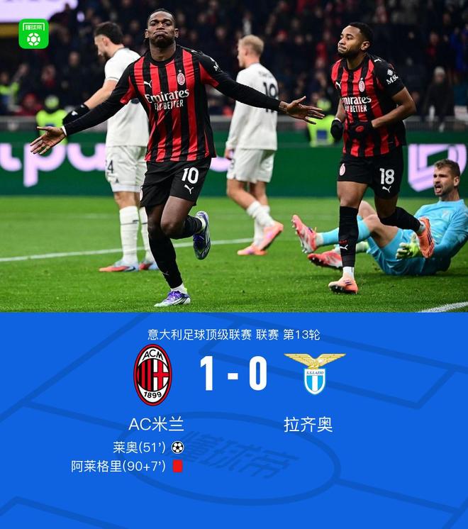 北京时间11月30日,意大利足球顶级联赛第13轮,AC米兰坐镇主场迎战拉齐奥。上半场,迈尼昂做出神扑。下半场,托莫里助攻,莱奥破门。比赛最后时刻,罗马尼奥利禁区内射门击中帕夫洛维奇手臂,主裁观看回放未给予点球判罚,阿莱格里不满判罚被红牌罚下。全场比赛结束,米兰1-0击败拉齐奥,在先赛的情况下暂时登上意甲榜首。